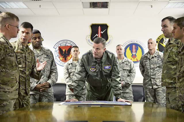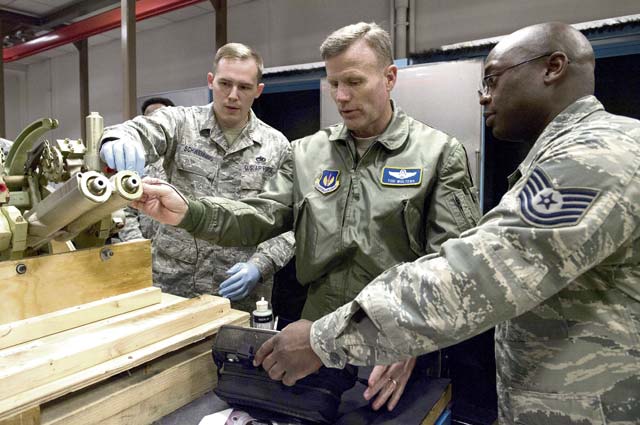Gen. Tod D. Wolters, U.S. Air Forces in Europe and Air Forces Africa commander, tests a piece of equipment for cracks with Tech. Sgt. James Cone and Staff Sgt. Timothy J. Schwenning II, both 86th Maintenance Squadron nondestructive inspection technicians, during an immersion tour Oct. 23 on Ramstein Air Base. Wolters coined all four Airmen assigned to the shop for their efforts in finding the best course of action for detecting cracks in the equipment saving the Air Force money. — Photo by Senior Airman Tryphena Mayhugh