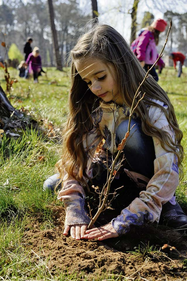Celeste Bronson, daughter of Maj. Hyrum Bronson, United States Transportation Command flight surgeon, presses dirt into a planted tree April 21 on Ramstein. Kaiserslautern Military Community students, 86th Civil Engineer Group Airmen and federal forest departments celebrated Earth Day by planting more than 1,500 trees on base.