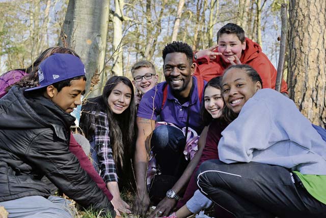 Ahmaed Cephus, Ramstein Middle School Advancement via Individual Determination instructor, poses for a photo as he plants a tree with his students April 21 on Ramstein. Students celebrated Earth Day demonstrating support for environmental protection by planting trees.