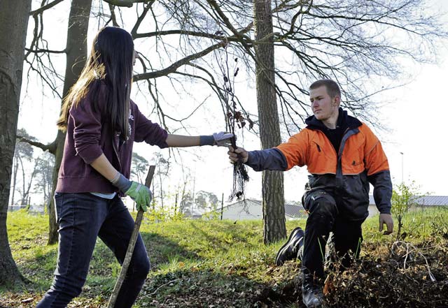 Jonas Scheidhauer (right), federal forest department apprentice, hands a tree to a Kaiserslautern Military Community student April 21 on Ramstein. Students, 86th Civil Engineer Group Airmen, and federal forest departments celebrated Earth Day by planting more than 1,500 trees on base.