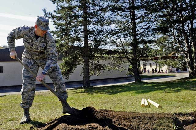 Col. Brian Hartless, 86th Civil Engineer Group commander, shovels dirt to plant a tree April 21 on Ramstein. The 86th CEG leadership and federal forest departments planted trees to celebrate Earth Day and raise awareness for environmental protection.