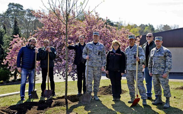 The 86th Civil Engineer Group leadership and federal forest departments participate in a tree planting ceremony April 21 on Ramstein. The tree planting ceremony was held to celebrate Earth Day and raise awareness for environmental protection.