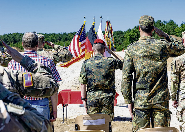 U.S. and German engineers from the 902nd Engineer Construction Company, 15th Engineer Battalion, 7th Engineer Brigade, and Spezialpionierregiment 164 salute their colors in an opening ceremony for their part in Defender Castle 25 at the Drawsko Pomorskie Combat Training Center, Poland, July 1, 2025. The joint exercise enhances interoperability and strengthens multinational partnerships.