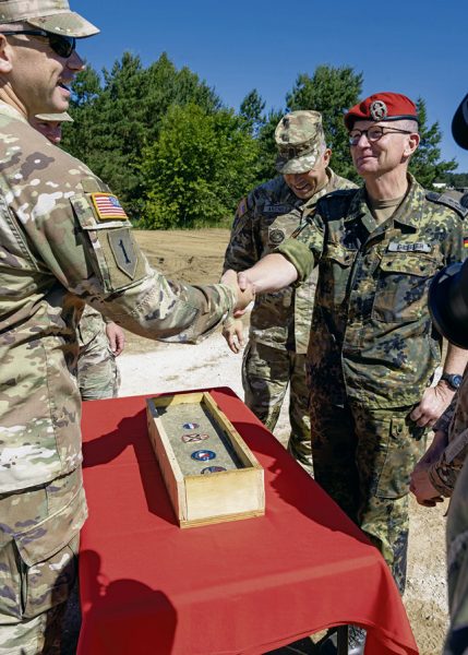 Coins from the 902nd Engineer Construction Company, 15th Engineer Battalion, 7th Engineer Brigade, and Spezialpionierregiment 164 are cemented into a headstone by their commanders to commemorate their work together on Defender Castle 25 at the Drawsko Pomorskie Combat Training Center, Poland, July 1, 2025. The joint effort enhances interoperability and strengthens multinational partnerships.