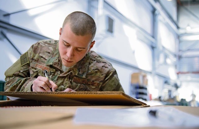 Senior Airman Zachary Strobel, 435th Contingency Response Squadron contingency aerospace maintenance journeyman, signs a receipt for equipment April 11 on Ramstein. Strobel is part of a deployment team from the 435th CRS going to stand up a base from a piece of flat land.