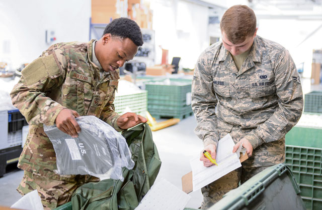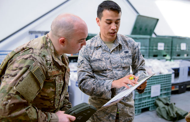 Senior Airman Greguy Bolivar, 435th Contingency Response Squadron (left), obtains equipment from the 86th Logistic Readiness Squadron April 11 on Ramstein. Airmen from Ramstein deploy regularly and require a variety of equipment provided by the 86th LRS to ensure their safety.