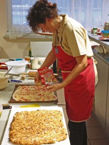 Karin Ullrich, a German cooking instructor for the Kaiserslautern USO, puts the final touches on a flammkuchen dish during a recent class held at Kapaun. Using locally purchased ingredients, Ullrich taught the class how to make several varieties of the traditional dish, which originated in France and is now popular in this region of Germany.