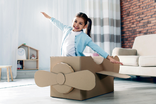 Cute,Little,Girl,Playing,With,Cardboard,Airplane,In,Living,Room