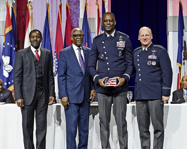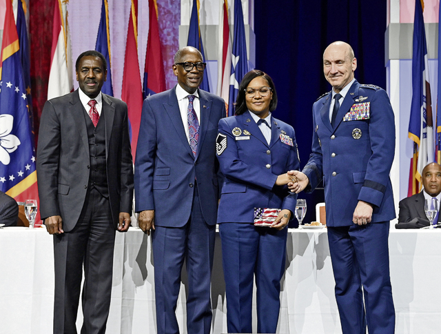 Air Force Chief of Staff Gen. David Allvin joined distinguished guests onstage to introduce Lt. Col. Shari Perkins, the Air Force’s annual award winner. A prior enlisted Airman, Perkins holds multiple advanced degrees and now serves in the DAF’s executive action group. Additionally, Perkins led projects that yielded more than $25,000 in funding for 40 STEM-related scholarships for youth.