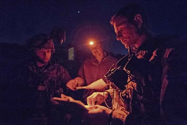 Tech. Sgt. Jeremy Rarang and Senior Airman Tormod Lillekroken, 2nd Air Support Operations Squadron joint terminal attack controllers, and Master Bombardier Mathiew Marcoux-Desrochers, a joint terminal attack controller from the Yankee Battery of the 2nd Regiment, Royal Canadian Horse Artillery, discuss training objectives as part of a night training scenario during exercise Serpentex 16 March 15 in Corsica, France.