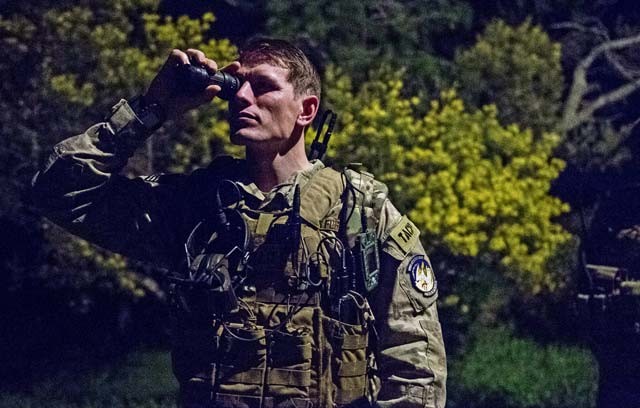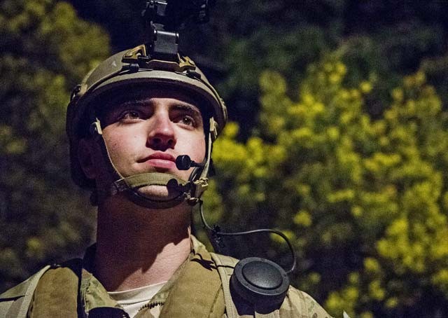 Senior Airman Tormod Lillekroken, 2nd Air Support Operations Squadron joint terminal attack controller, looks through a night vision monocular as part of a night training scenario during exercise Serpentex 16 March 15 in Corsica, France. Lillekroken recently reached his goal to be qualified as a joint terminal attack controller. Lillekroken has been in the tactical air control party career field for more than four years.