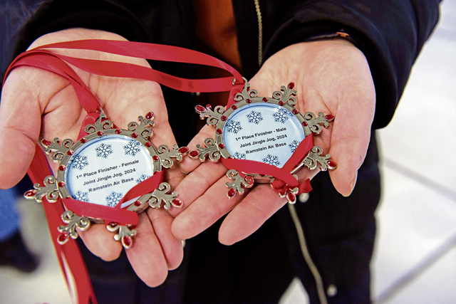 First, second and third place medals for both male and female runners are given out during the Joint Jingle Jog at Ramstein Air Base, Germany, Dec. 14, 2024. The event fosters a sense of community and holiday cheer among participants. (U.S. Air Force photo by Tech. Sgt. Alexandra M. Longfellow)