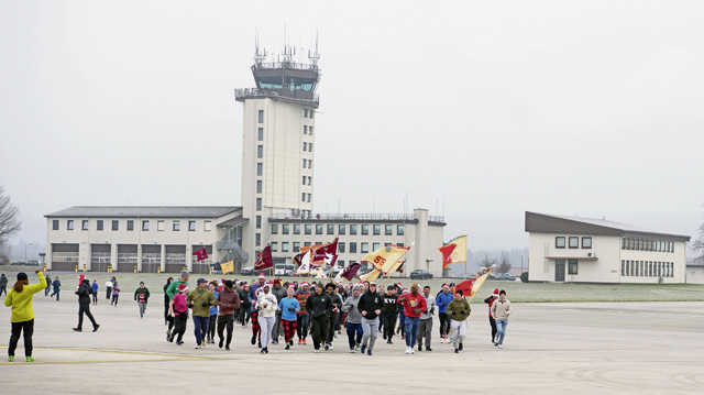 Runners brave the cold running the Joint Jingle Jog at Ramstein Air Base, Germany, Dec. 14, 2024. The run aimed to bring the base community together while encouraging healthy habits. (U.S. Air Force photo by Tech. Sgt. Alexandra M. Longfellow)