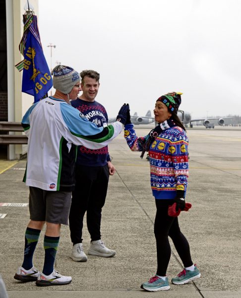 U.S. Air Force Chief Master Sgt. Bryant Roy, 86th Operations Support Group senior enlisted leader, high-fives Renae Fischer, 86th Airlift Wing executive director, after she completes the Joint Jingle Jog at Ramstein Air Base, Germany, Dec. 14, 2024. The 21st Theater Sustainment Command and the 86th Airlift Wing sponsored the event to encourage physical fitness and camaraderie among both branches of the military. (U.S. Air Force photo by Tech. Sgt. Alexandra M. Longfellow)