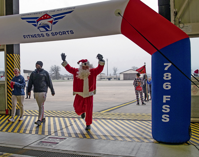 Santa celebrates as he finishes the Joint Jingle Jog at Ramstein Air Base, Germany, Dec. 14, 2024. The 21st Theater Sustainment Command and the 86th Airlift Wing sponsored the event to encourage physical fitness and camaraderie among both branches of the military. (U.S. Air Force photo by Tech. Sgt. Alexandra M. Longfellow)