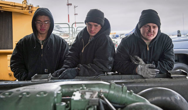 Airmen 1st Class Briann Eddy (left), Brennan Gregory (center) and Dakota Staten, 86th Vehicle Readiness Squadron special vehicle maintenance journeymen, inspect a Tunner 60K Loader Jan. 30 on Ramstein. All three have been together since technical training in California and are part of a 12-man shop responsible for keeping vehicles on the flightline operable at all times.