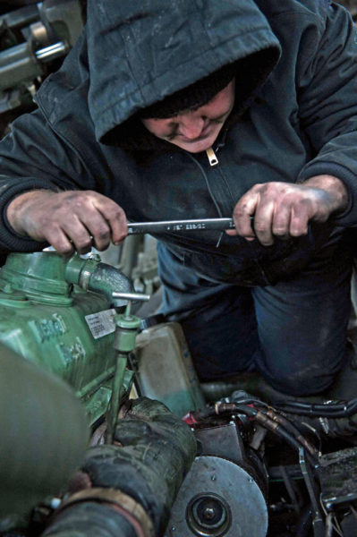 Airman 1st Class Briann Eddy, 86th Vehicle Readiness Squadron special vehicle maintenance journeyman, pulls himself from under a heavy operating vehicle after helping his co-workers remove a faulty starter Jan. 30 on Ramstein. From 7 a.m. to 4 p.m., these Airmen spend their day doing the greasy work that keeps vehicles ready for any mission.