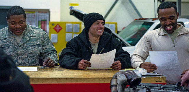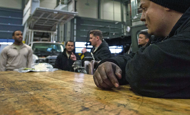 Airman 1st Class Brennan Gregory, 86th Vehicle Readiness Squadron special vehicle maintenance journeyman (center), discusses the day’s work with his co-workers during a shop meeting Jan. 30 on Ramstein. Gregory says his passion for the job comes from the people he works with.