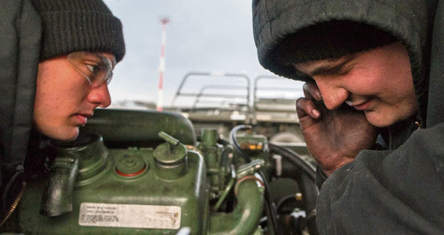 Airmen 1st Class Brennan Gregory (left) and Dakota Staten, 86th Vehicle Readiness Squadron special vehicle maintenance journeymen, communicate with their shop after they removed a vehicle’s stuck exhaust manifold to gain access to a faulty starter Jan. 30 on Ramstein.