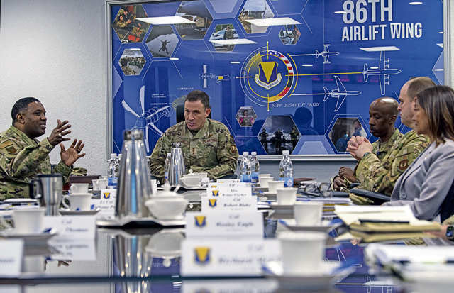 U.S. Air Force Lt. Gen John D. Lamontagne, U.S. Air Forces in Europe-Air Forces Africa deputy commander, is briefed on the 86th Airlift Wing mission by Brig. Gen. Otis C. Jones, 86 AW commander, and other senior leaders at Ramstein Air Base, March 22. Lamontagne took a tour of Ramstein AB and met the Airmen who support the mission on a daily basis. Photos by Airman 1st Class Tabatha Chapman