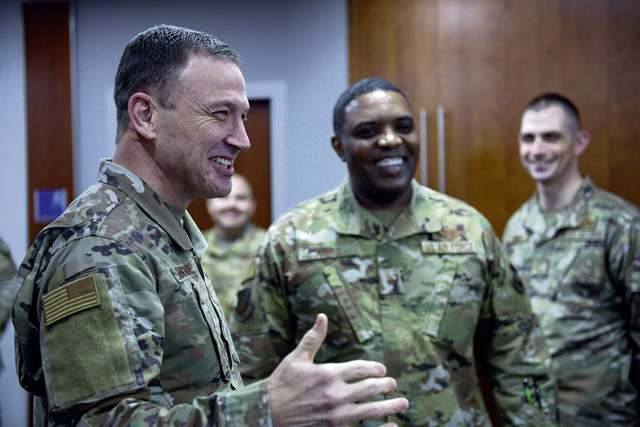 Lt. Gen. John D. Lamontagne, U.S. Air Forces in Europe – Air Forces Africa deputy commander, meets Brig. Gen. Otis C. Jones, 86th Airlift Wing commander, team at Ramstein Air Base, Germany, March 22, 2023. Lamontagne toured the 86th Airlift Wing to meet Airmen and learn about their contribution to the mission. (U.S. Air Force photo by Airman 1st Class Kaitlyn Oiler)