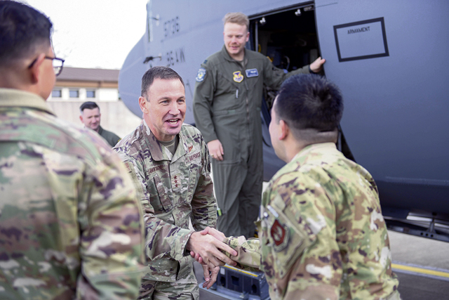 Lt. Gen. John D. Lamontagne, U.S. Air Forces in Europe – Air Forces Africa deputy commander, greets Airmen before a tour of a C-130J Hercules at Ramstein Air Base, Germany, March 22, 2023. Lamontagne toured the aircraft to understand the mission and challenges that Airmen face.(U.S. Air Force photo by Airman 1st Class Kaitlyn Oiler)