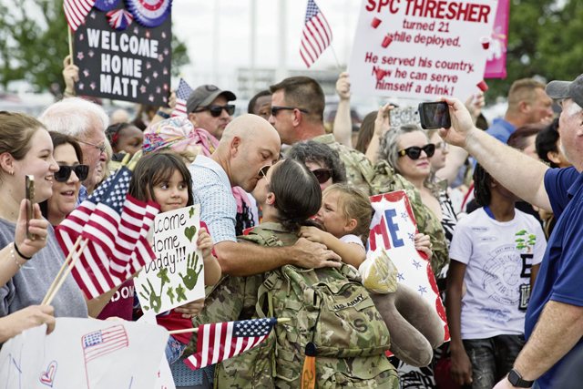 Indiana National Guard Warrant Officer Amanda Spear with the 38th Infantry Division celebrates with her loved ones at the Indianapolis International Airport, Wednesday, Aug. 20, 2025. The soldiers deployed in September 2024 to the Middle East to support Operation Spartan Shield, which helps to maintain and strengthen defense relationships and also helps build partner capacity. (Indiana National Guard photo by Staff Sgt. Jonah Alvarez)