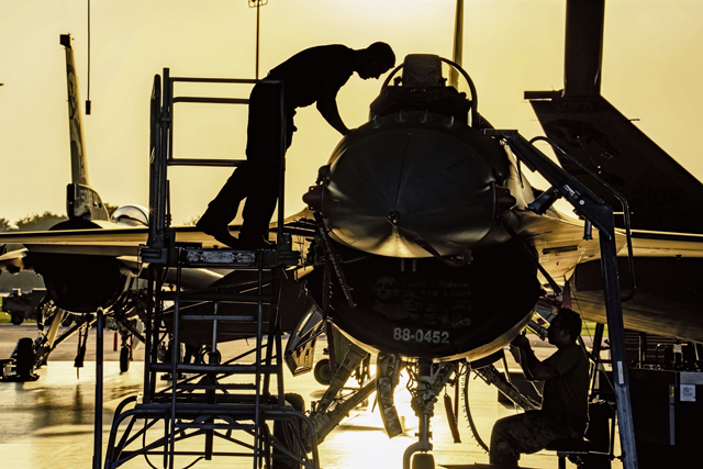 Staff Sgts. Tyler Casanova, left, and Skyler Dick, both aircraft electricians with the 114th Maintenance Squadron, service a temperature control unit on a F-16 Fighting Falcon during night flying operations at Joe Foss Field, South Dakota, Aug. 21, 2025. Night operations keep 114th Fighter Wing Airmen current on required procedures and sustain readiness to defend the homeland. (U.S. Air National Guard photo by Master Sgt. Luke Olson)