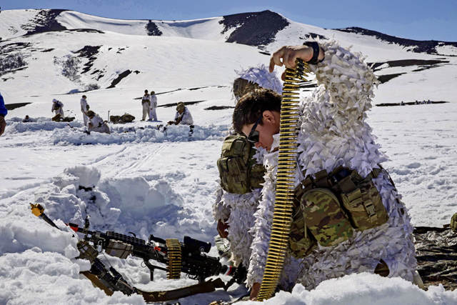 U.S. Army Cpl. Andrew Parlatl and Cpl. Angel Garcia, infantrymen with the 3rd Brigade Combat Team, 10th Mountain Division, load an M249 squad automatic weapon during Exercise Southern Vanguard 25, in Antuco, Chile, Aug. 26, 2025. Exercise Southern Vanguard 25 underscores the U.S. Army’s enduring commitment to regional partnership as U.S. forces deploy to Chile to conduct combined mountain warfare, field, and command post training alongside Chilean forces, with participation from Argentina and Peru – strengthening interoperability, shared readiness, and mutual trust while advancing regional security and cooperation across the Western Hemisphere. (U.S. Army National Guard photo by Sgt. Richelle Cruickshank)