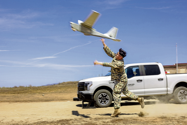U.S. Marine Corps Lance Cpl. Eric Granados, an intelligence specialist with 3rd Battalion, 5th Marine Regiment, 1st Marine Division, I Marine Expeditionary Force, launches an RQ-20 Puma during a Dead Center small unmanned aircraft system training on Marine Corps Base Camp Pendleton, California, Aug. 20, 2025. Dead Center is an artificial intelligence enabled system that enhances sUAS operators’ ability to perform a wide range of surveillance and reconnaissance missions. (U.S. Marine Corps photo by Sgt. Trent A. Henry)