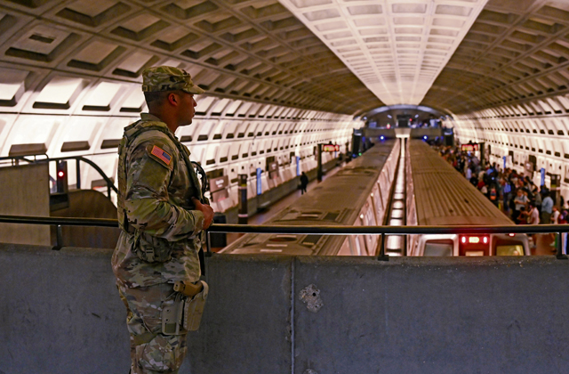 U.S. Soldiers with the South Carolina Army National Guard patrol Dupont metro station in Washington D.C., Aug. 25, 2025. About 2,000 National Guard members are supporting the D.C. Safe and Beautiful mission providing critical support to the D.C. Metropolitan Police Department in ensuring the safety of all who live, work and visit the District. (U.S. Air National Guard photo by Staff Sgt. Natalie Filzen)
