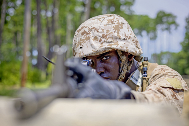Rct. Dontae McDermott, a recruit with Hotel Company, 2nd Recruit Training Battalion, holds a defensive position while conducting Basic Warrior Training (BWT) on Marine Corps Recruit Depot Parris Island, S.C., Aug. 27, 2025. BWT is a one week-long training event that teaches recruits the basics of combat survival and rifle maneuvers. (U.S. Marine Corps photo by Lance Cpl. Ayden Cassano)