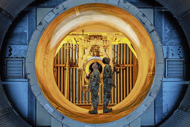 U.S. Air Force Senior Airman Samuel Griego, left, and Airman 1st Class Tavi Carter-Smith, 509th Maintenance Squadron aerospace propulsion journeymen, inspect the exhaust tube in the test cell at Whiteman Air Force Base, Missouri, Aug. 20, 2025. U.S. Air Force aerospace propulsion specialists test aircraft engines and diagnose problems, including the fuel, oil, electrical and engine airflow systems. (U.S. Air Force photo by Staff Sgt. Joshua Hastings)