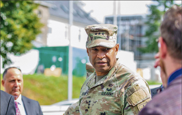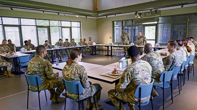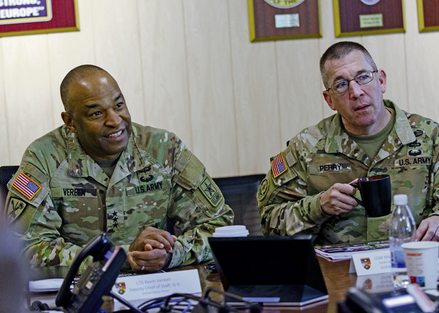 U.S. Army Lt. Gen. Kevin Vereen, deputy chief of staff, G-9, and Sgt. Maj. Michael Perry, the senior enlisted advisor to the deputy chief of staff, visited Smith Barracks and Wetzel Kaserne in Baumholder, Aug. 8. The purpose of the visit was to survey building infrastructure where Soldiers and their families reside, and to get a better understanding of their needs and overall quality of life. The visit concluded with a lunch with Soldiers at the Knight’s Lair Warrior dining facility.