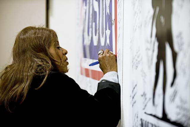 Gloria Gaynor, “I Will Survive” singer, signs a USO poster at the Contingency Aeromedical Staging Facility on Ramstein during a tour Dec. 26. Gaynor interacted with the CASF staff and patients during her visit and spoke about resiliency, survival and empowerment.