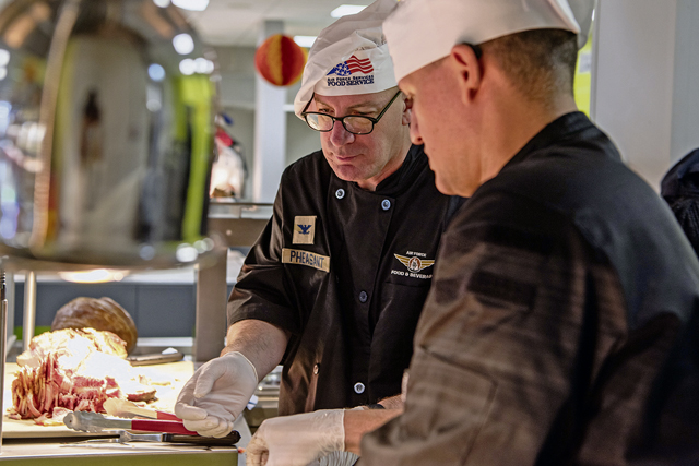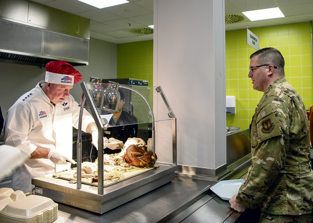 U.S. Air Force Col. Matthew A. Bartlett, 435th Air Ground Operations Wing commander, carves a turkey in the Rheinland Inn Dining Facility during Thanksgiving at Ramstein Air Base, Germany, November 28, 2024. Leaders from around the DoD served Thanksgiving meals to the Kaiserslautern Military Community to show their appreciation during the holiday season. (U.S. Air Force photo by Tech. Sgt. Miquel Jordan)