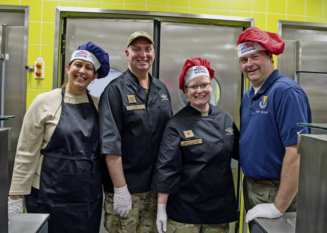 U.S. Air Force Brig. Gen. Adrienne L. Williams, 86th Airlift Wing commander, right, her husband, Rodney, U.S. Air Force Chief Master Sgt. Louis J. Ludwig, 86th Airlift Wing command chief, left, and his wife, Christi, pose for a photo in the Rheinland Inn Dining Facility during the Thanksgiving luncheon at Ramstein Air Base, Germany, November 28, 2024. Leaders from around the DoD served Thanksgiving meals to the Kaiserslautern Military Community to show their appreciation during the holiday season. (U.S. Air Force photo by Tech. Sgt. Miquel Jordan)