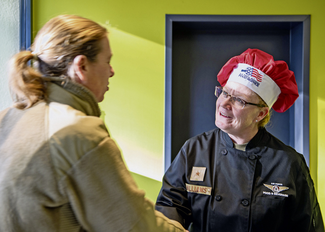 U.S. Air Force Brig. Gen. Adrienne L. Williams, 86th Airlift Wing commander, greets Airmen entering the Rheinland Inn Dining Facility during the Thanksgiving luncheon at Ramstein Air Base, Germany, November 28, 2024. Leaders from around the DoD served Thanksgiving meals to the Kaiserslautern Military Community to show their appreciation during the holiday season. (U.S. Air Force photo by Tech. Sgt. Miquel Jordan)