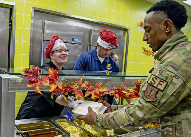 U.S. Air Force General James B. Hecker, U.S. Air Forces in Europe commander, serves food to service members in the Rheinland Inn Dining Facility during Thanksgiving at Ramstein Air Base, Germany, November 28, 2024. Leaders from around the DoD served Thanksgiving meals to the Kaiserslautern Military Community to show their appreciation during the holiday season. (U.S. Air Force photo by Tech. Sgt. Miquel Jordan)