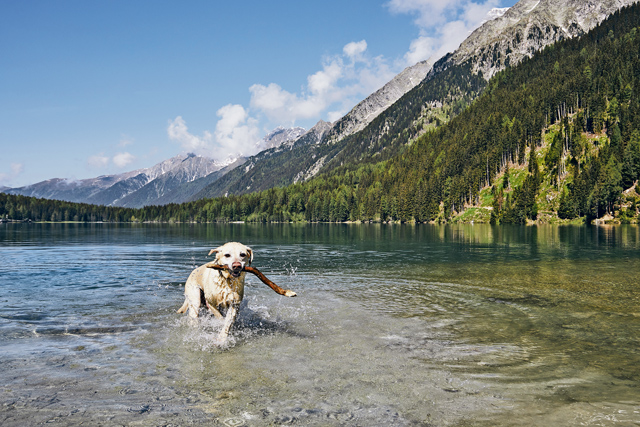Dog,With,Stick,In,Mountains,Lake.,Happy,Labrador,Retriever,Running