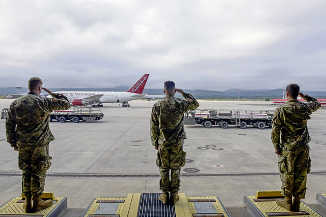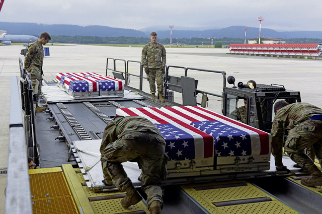 U.S. Air Force Airmen render a final salute to the possible remains of World War II soldiers during a dignified transfer at Ramstein Air Base, June 23. The remains will undergo examination for possible identification by Defense Prisoners of War/Missing in Action Accounting Agency forensic anthropologists. The DPAA’s mission is to provide the fullest possible accounting for our missing personnel to their families and the nation.