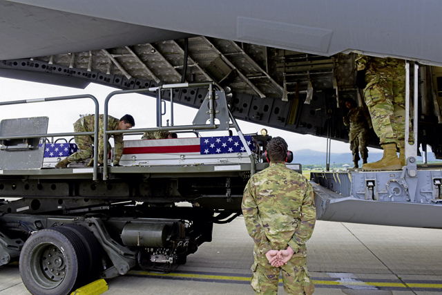 U.S. Air Force Airmen from the 721st Aerial Port Squadron load transport cases containing the possible remains of unidentified World War II soldiers onto a C-17 Globemaster III aircraft at Ramstein Air Base, June 23. The DPAA’s mission is to provide the fullest possible accounting for our missing personnel to their families and the nation.