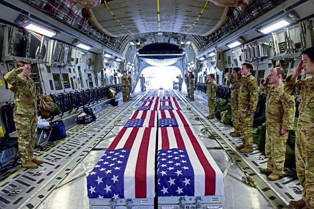 U.S. Air Force Airmen from the 721st Aerial Port Squadron render a salute to the possible remains of unidentified soldiers from World War II at Ramstein Air Base, June 23. Remains are identified at labs at either Hickam Air Force Base, Hawaii, or Offutt Air Force Base, Neb. The Defense POW/MIA Accounting Agency’s mission is to provide the fullest possible accounting for our missing personnel to their families and the nation.