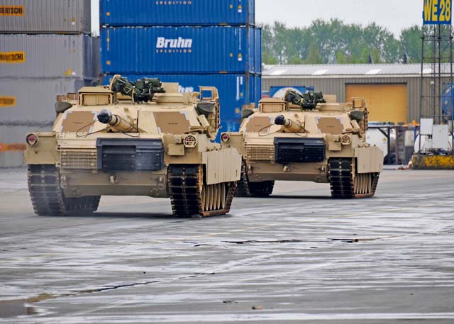 Two M1 Abrams tanks move down the docks of Antwerp toward their holding area after being offloaded from the freighter “Resolve,” April 24.