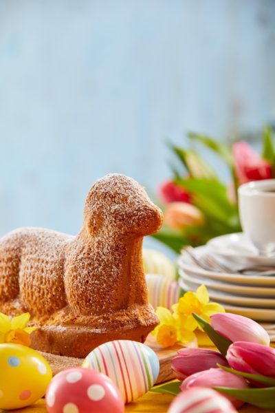 - Spray the lamb mold with cooking spray or lightly coat with butter and lightly sprinkle with flour. Place the lamb cake mold onto a baking sheet. Gradually pour the dough into the center of the mold so the dough does not run along the edge.