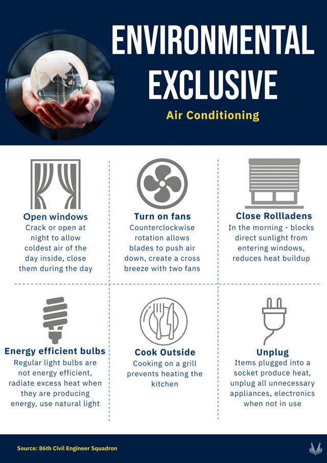 “Air conditioners require too much energy to function properly,” said Markus Schaaff, 86th CES electrical engineer. “Typically, air pollution mainly comes from the burning of fossil fuels, and much of the world’s energy is still produced this way. Less air conditioning usage helps to reduce the amount of carbon dioxide pumped into our atmosphere and curbs the effects of ozone layer depletion.