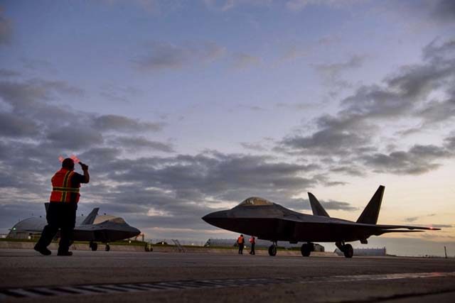 An F-22 Raptor assigned to the 1st Fighter Wing, Joint Base Langley-Eustis, Va., taxis Oct. 13 at Spangdahlem Air Base. This F-22 flying training deployment is an example of how the U.S. is engaged, postured, and ready with credible force to assure, deter, and defend in an increasingly complex security environment. — Photo by Staff Sgt. Jonathan Snyder
