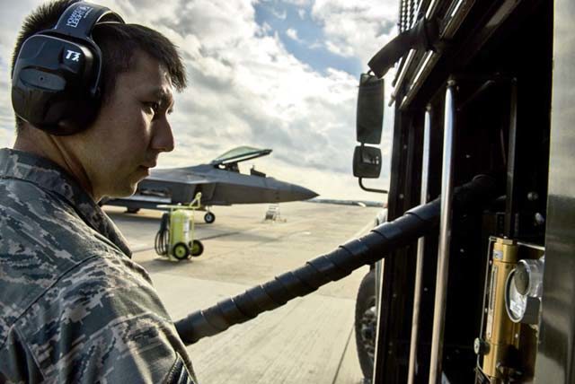 Senior Airman Josh Kampa, 52nd Logistic Readiness Squadron fuels distribution operator, refuels an F-22 Raptor assigned to the 1st Fighter Wing, Joint Base Langley-Eustis, Va., Oct. 13 at Spangdahlem Air Base. — Photo by Staff Sgt. Jonathan Snyder