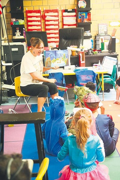 Nicole Flores, school counselor, reads a book to students during a fall harvest event held at VES.