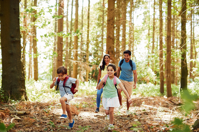 Family,With,Backpacks,Hiking,Or,Walking,Through,Woodland,Countryside
